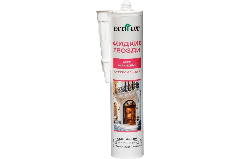 Монтажный клей Жидкие гвозди ECOLUX предназначен для приклеивания декоративно-отделочных материалов из пенополистирола, пенопласта, пенополиуретана, гипса, пластика, гипрока, древесины и древесных плит (ДСП, ОСП, МДФ, ДФП), гипсокартона, пробки, искусственного и натурального камня, керамики на впитывающие строительные основания. Не подходит для приклеивания: зеркал, полиэтилена, пропилена, тефлона, силикона.