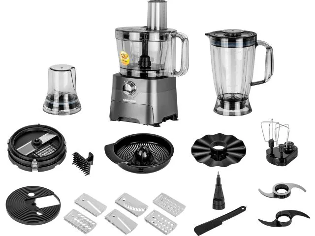 Многофункциональный кухонный комбайн 14 в 1 предназначен для перемешивания, измельчения, нарезки кубиками и приготовления эмульсии и соков из продуктов питания, обладает функциями миксера, блендера, кофемолки и соковыжималки.