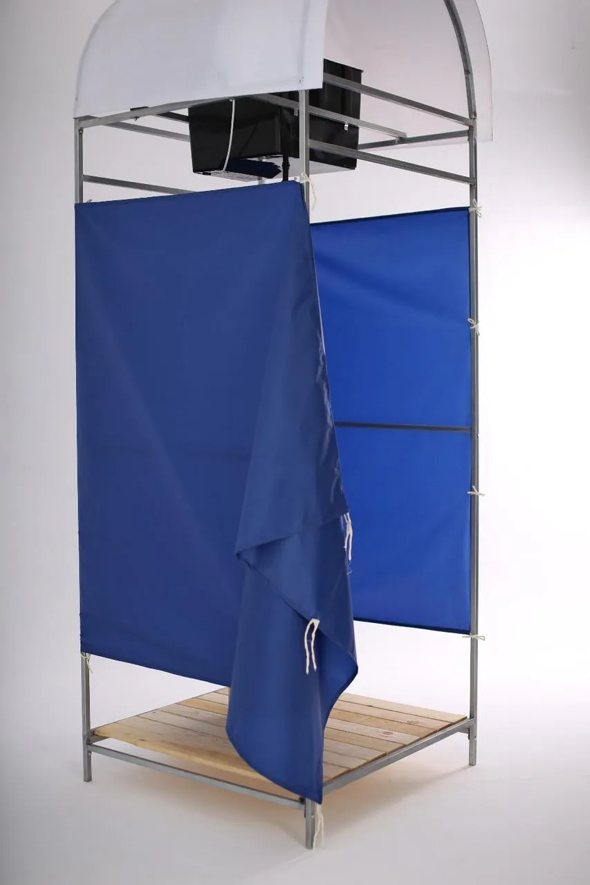 В комлект входит бак с подогревом "Элбэт " 55 л. с подогревом, деревянный пол , поликарбонат на крышу. Габариты кабины в сборе без бачка: 94х94х250 см Каркас душа изготовлен из профильной оцинкованной трубы сечением 20*20 мм. Комплектуется водонепронецаемой шторкой синего цвета .
