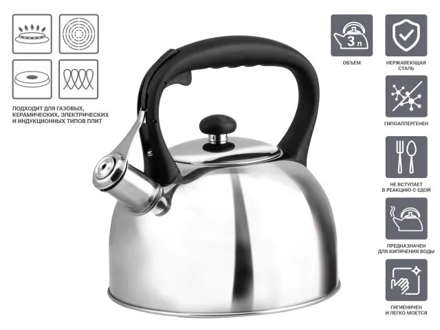 Пищевая нержавеющая сталь, из которой изготовлен чайник, соответствует всем токсикологическим и гигиеническим нормам, не выделяет в воду вредных веществ и не отражается на ее вкусе.