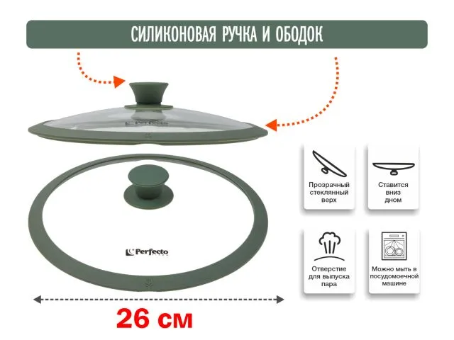 Крышка не царапает антипригарное покрытие. Для того, чтобы крышка не запотевала присутствует отверстие для выхода пара. Паровывод <спрятан> под силиконовым ободом и крышка выглядит более эстетично. За счет обода из силикона, меньший риск разбить крышку при падении.