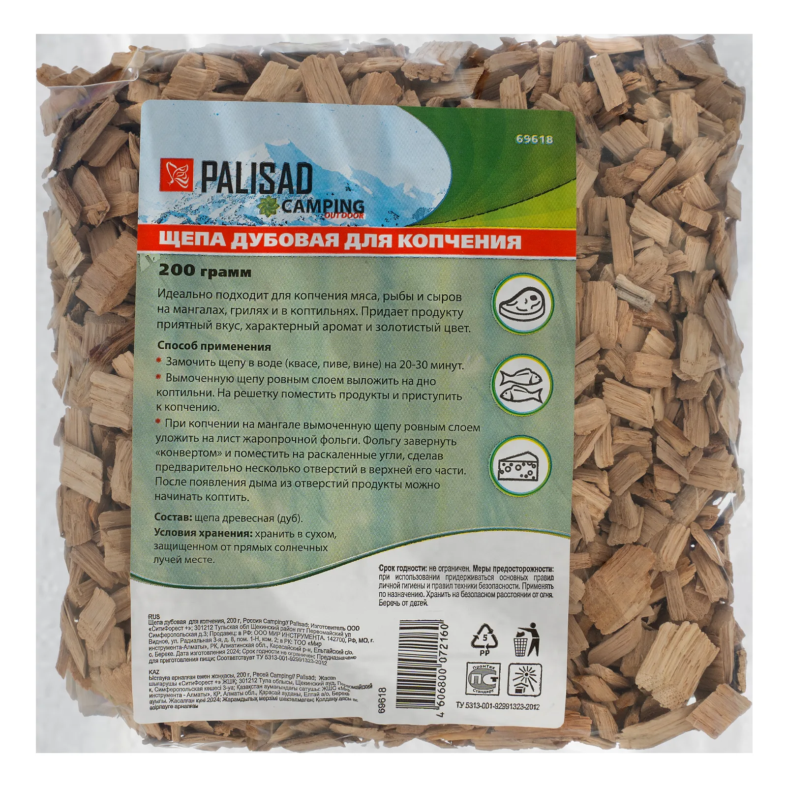 Дубовая щепа для копчения Palisad Camping 69618, 200 г в упаковке, используется для горячего или холодного копчения мяса, рыбы, сыров. Пригодится на даче или пикнике.