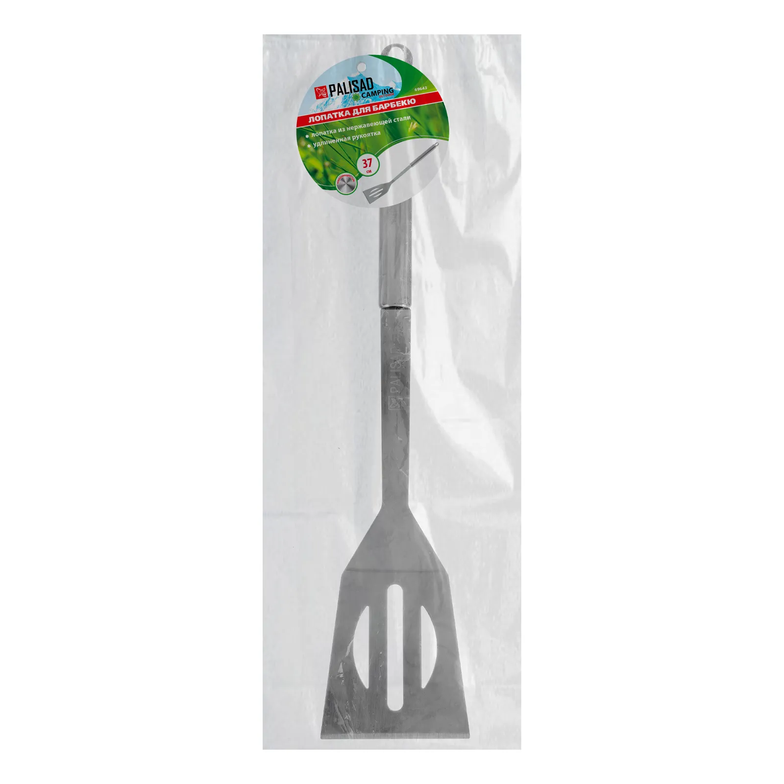 Лопатка для барбекю Palisad Camping 69643 длиной 37 см, из нержавеющей стали, позволяет приготовить мясо, рыбу и овощи на гриле или в мангале. С ее помощью можно удобно и безопасно переворачивать и снимать продукты.